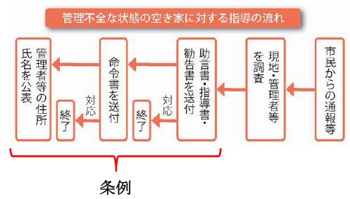 市では、条例に基づき、管理不全な空き家として把握した建物で、所有者等が特定できたものについて、適正な管理をして頂くよう助言書や指導書、勧告書を送付し、それでも改善がなされない場合は、命令書の送付や所有者等の住所氏名等を公表することとしています。