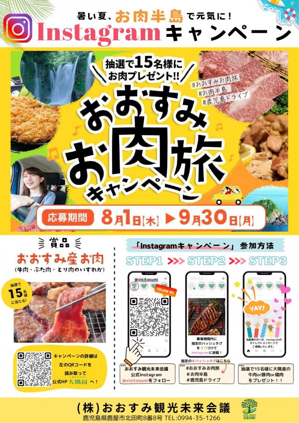 鹿屋市、垂水市、曽於市、志布志町、大崎町、東串良町、錦江町、南大隅町、肝付町の飲食店等で美味しく食べている様子などインスタグラムに投稿すると抽選で15名様に大隅産のお肉(牛・豚・鶏のいずれか)が当たる「おおすみお肉旅」インスタキャンペーンを開催!