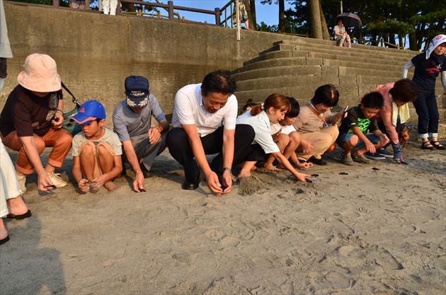 浜田海水浴場にて海ガメ放流会に参加しました。2ヶ月以上の間、欠かさず卵の世話をしてくれた浜田小学校の児童や先生、保護者を含め約80名の方々が「海ガメの旅立ち」に参加いただきました。ふ化した子ガメは、参加された皆さんに温かく見守られ、元気よく海に帰っていきました。