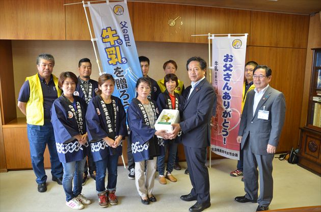 県酪農業協同組合大隅支所の青年女性会議メンバーが、大隅産牛乳の消費拡大を目的に「父」と「牛乳」をかけた「父の日には牛乳(ちち)を贈ろう!」キャンペーンで、市役所を訪ねてくれました。私も牛乳は大好きで毎日飲んでいます。今回のキャンペーンで多くの皆さんに牛乳を飲んでいただけることを願っています