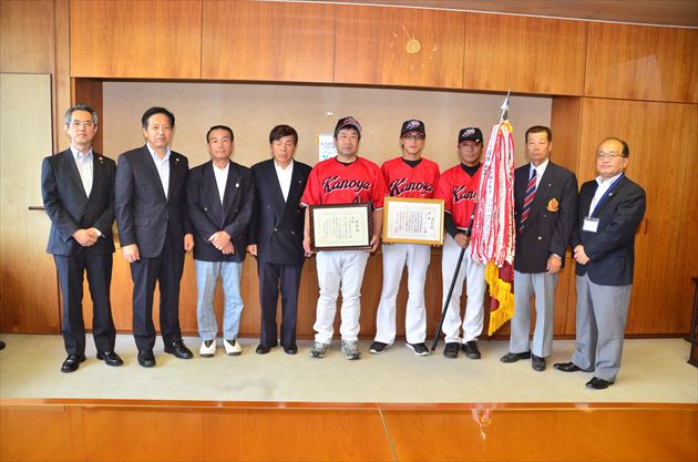 6月に開催された第30回全日本壮年男子ソフトボール選手権大会県予選で優勝し、9月に石川県で開催される日本マスターズ大会への出場を決めた鹿屋KSCの選手の皆さんが訪れてくれました。