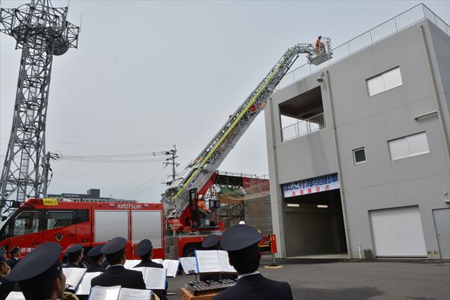 大隅肝属地区消防組合で25年間使用してきた「はしご付消防自動車」を更新しました。新しいはしご車は、はしごの届く高さが約35メートルではしごの先端の約2.5メートルが屈折するなど最先端の機能を備えていますので、市民の生命・財産を守る最新機として配備できました。しかし、もしもに備えての配備ですのでこれからも広報活動や防火対策を積極的に進めてまいります。