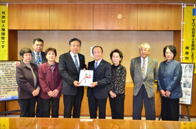 市役所で行っていた拉致問題の解決を訴える署名の綴りと寄附金を、拉致被害者家族の市川健一さんと特定失踪者家族の会にお渡しいたしました。市川さんは「皆さんの気持ちを励みに、解決に向けて頑張りたい」と思いを述べられました。