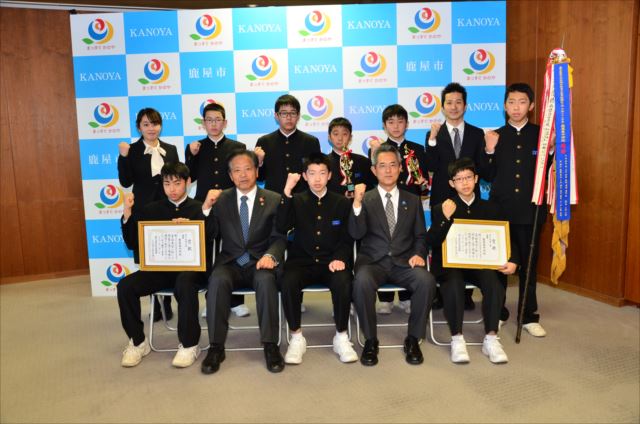 昨年11月に行われた「全九州卓球選手権大会県予選」で優勝し、長崎県で開催される九州大会への出場が決まった、鹿屋東中学校男子卓球部の選手、監督の皆さんがお越しくださいました。「九州大会でもベストを尽くし、好成績を収めてください」と激励しました。