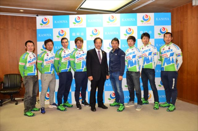大阪府に拠点を置く自転車ロードレースチーム「マトリックスパワータグ」の選手7人が、関係者とともにお越しくださいました。現在、市内で合宿している選手の皆さんからは「練習する道路環境がものすごくよいので、また合宿に訪れたい」と感想をいただきました。私からは「次回の合宿も是非、鹿屋市で行っていただきたい」とお話いたしました。