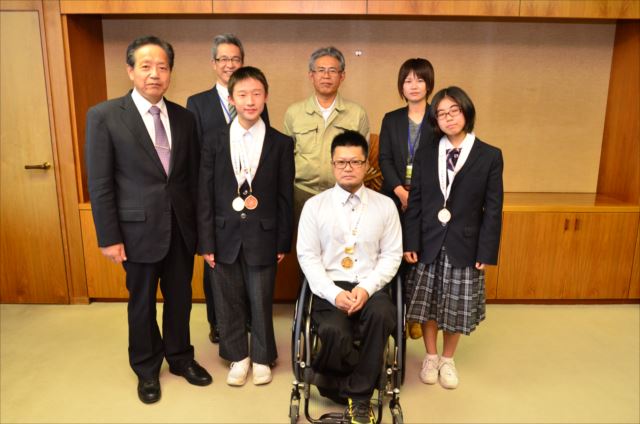 第17回全国障害者スポーツ大会に出場した井上愛理さん、園田久さん、中崎星也さんが大会結果報告にお越しくださいました。3人はそれぞれ、参加した種目で金メダルを獲得され、練習での苦労や、障がい者スポーツの普及、世界大会出場など、今後の目標をお話しくださいました。東京で開催されるパラリンピックへの出場を目指して頑張っていただきたいと思います。