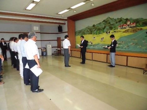 農業委員任命式及び農業委員会臨時総会に出席しました。農業委員会法の改正により、農業委員の選出方法が公選制から市町村長の任命制になり、委員数も40名から21名に変更になりました。今回の改正で、農地等の利用の最適化が主たる業務に位置付けられ、木塲会長をはじめ農業委員の皆さんには、21名の新設された農地利用最適化推進委員の皆さんと一体となって、本市農業を支える地域の核となっていただきますようよろしくお願いいたします。