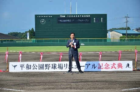 平和公園野球場リニューアル記念式典を開催しました。平和公園野球場は、これまで多目的野球場として利用いただいてきましたが、今回、硬式野球に対応できる専用球場として新たに整備したところです。本野球場は、屋内練習場と一体的に利用できることから、高校・大学・社会人の合宿等での利用の増加が期待されます。本球場が鹿屋市、大隅地域における交流拠点として多くの方々に愛される施設となることを期待しています。
