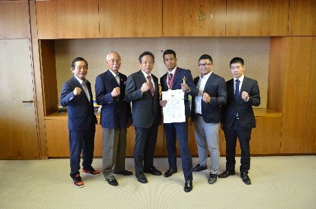 11月に茨城県で開催された「第88回全日本ボクシング選手権大会」ウェルター級(69kg)において、優勝し、あわせて敢闘賞を受賞された岡澤セオン選手と関係者の皆さんが大会の結果報告にお越しくださいました。岡澤選手は、鹿児島県体育協会及び鹿屋市ボクシング協会に所属され、鹿屋工業高校ボクシング部を指導しています。「今後とも技術向上に励み、オリンピックやかごしま国体に向けて頑張ってください。」とエールを送りました。