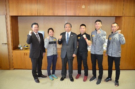 3月2日から13日までの日程で、鹿屋市でスポーツ合宿を行う日本食研実業団トライアスロン部の田中麻優選手、古山大選手、岩本敏選手と鈴木部長、佐藤ヘッドコーチが合宿等の報告にお越しくださいました。7日には、同部の平松コーチ兼選手による中学生以上の競技者とその指導者、保護者等を対象とするスポーツセミナーもリナシティかのやで開催されます。最近は、トライアスロンをする人(選手)も見る人(応援)もより楽しめるレースが増えてきています。