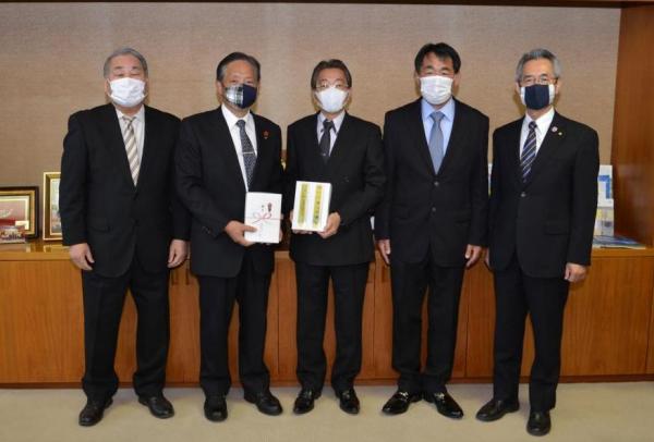 鹿屋女子高等学校の総合選択制における家庭科探求授業の中で、生徒の皆さんが、私と教育長をイメージしたマスクを製作し、市役所まで贈呈にお越しくださいました。