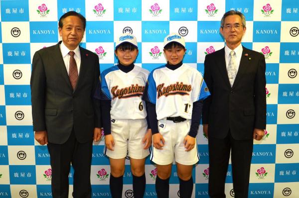 福岡県北九州市で開催される「JOCジュニアオリンピックカップ第17回都道府県対抗全日本中学生女子ソフトボール大会」に、県選抜選手として出場する大隅レッドエンジェルスの楠原雪穂選手及び戸塚小町選手の2名が表敬訪問のため、市役所にお越しくださいました。