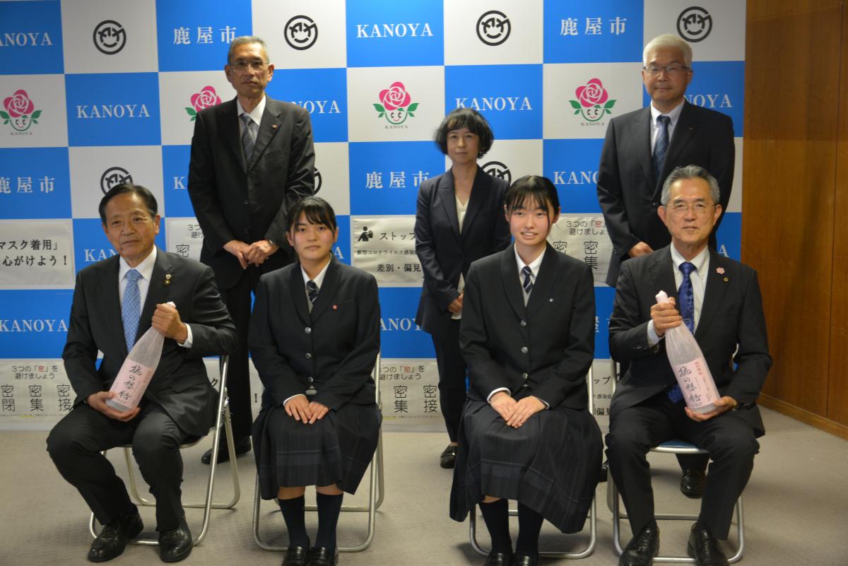 鹿屋女子高校書道部がラベル作成に協力した焼酎「椛の想結(はなのおもい)」(小鹿酒造(株))の発売に際し、関係者が市役所にお越しくださいました。