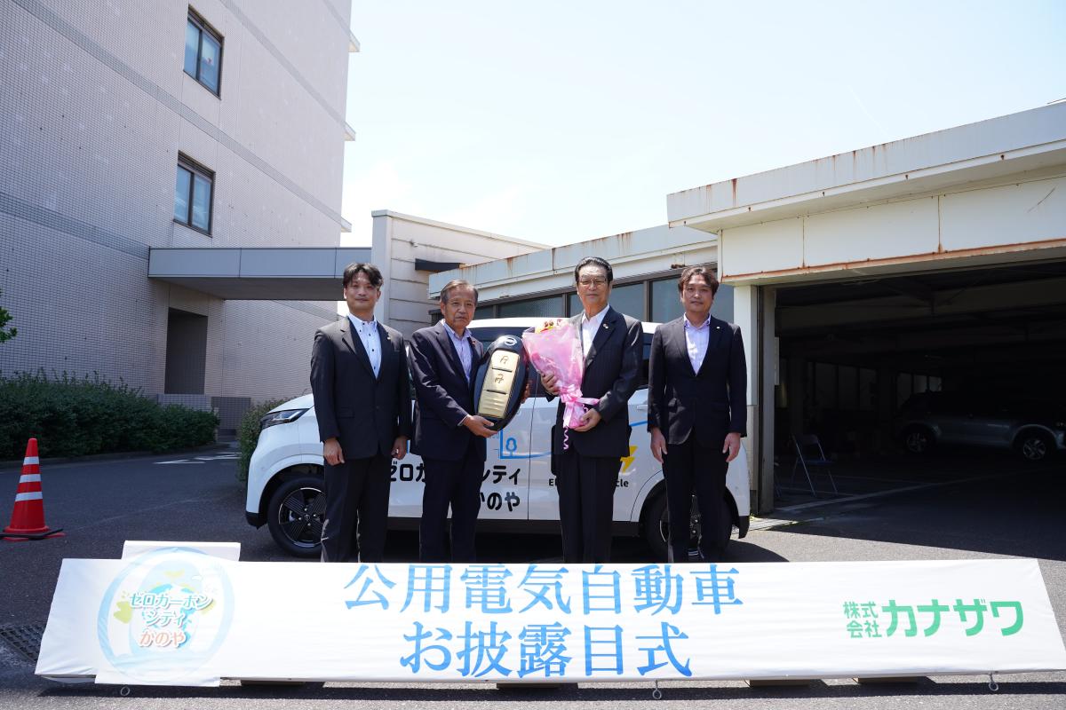 株式会社カナザワ様より、グリーン社会の実現に役立ててほしい、とお寄せいただいた寄付金を活用し、公用電気自動車の購入及び自動車充電設備を設置いたしました。