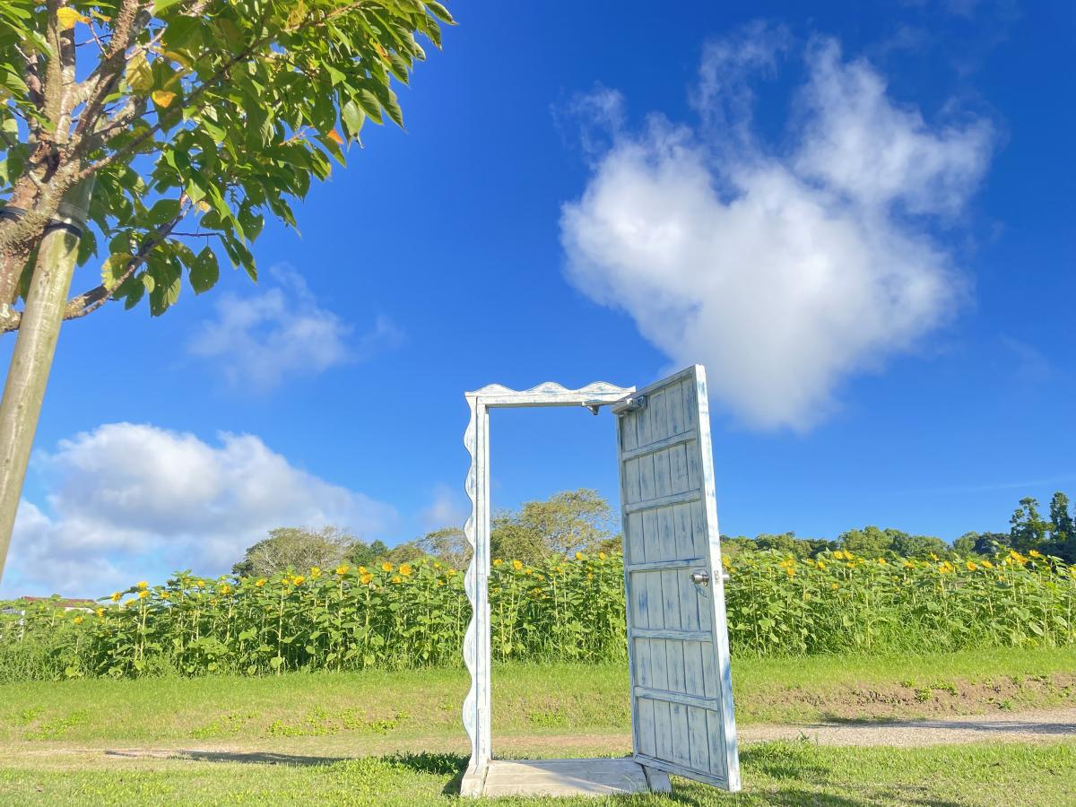 青空をバックに幻想的な一枚が撮れます。 ヒマワリが咲いたら黄色い帯ができます。 |