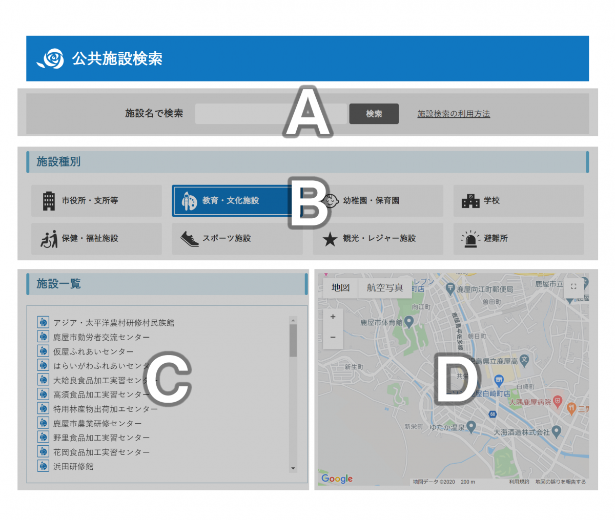 キーワード入力欄(A)に施設名を入力し、公共施設の名称を検索することができます。