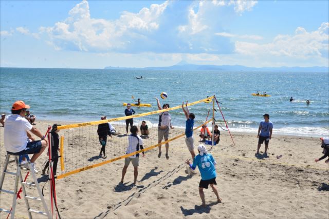 当日は、バナナボートやディンギーヨット、ウインドサーフィンなどの体験が行われ、参加者はあまり体験することのないマリンスポーツを満喫。また、初開催となったビーチバレーボールには、24チーム約120人が参加し熱戦を繰り広げました。